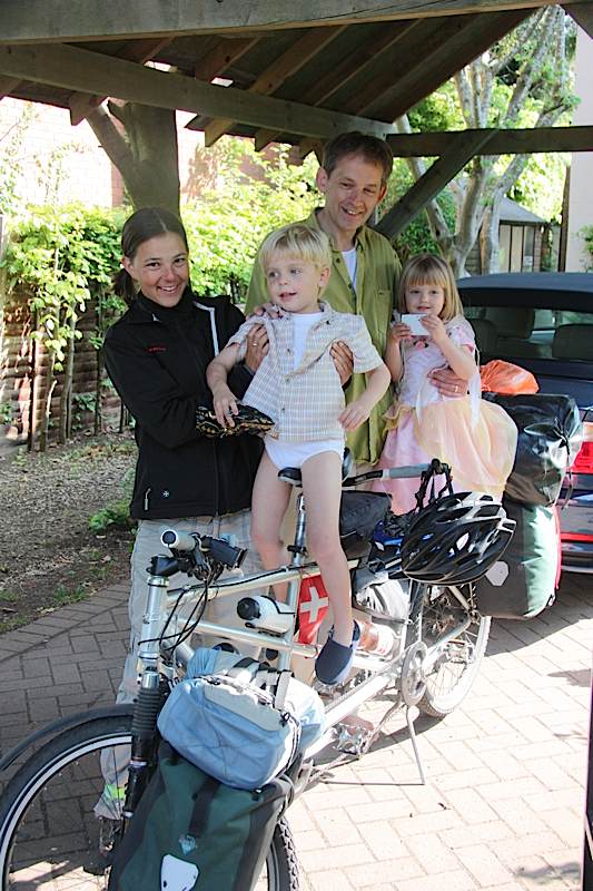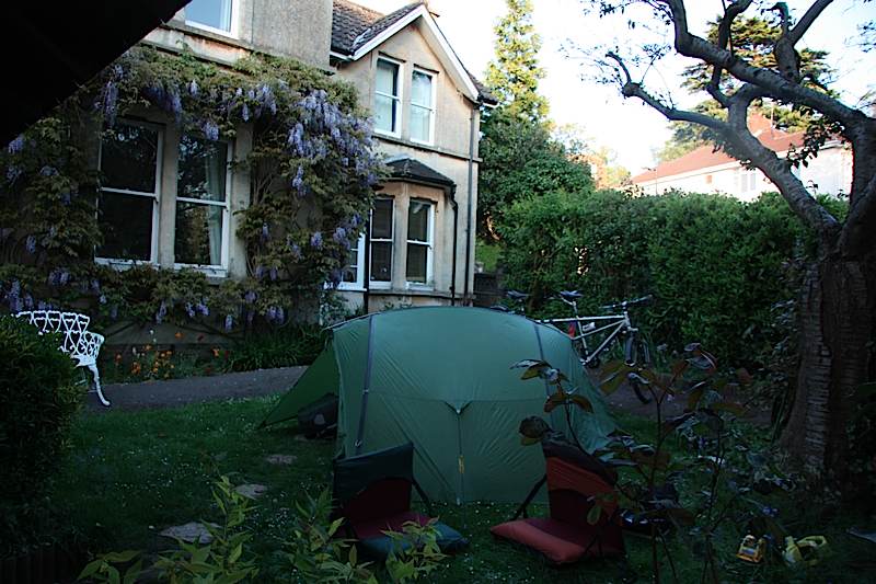 Nachdem wir in Bristol auf dem Caravan-Camping nicht willkommen waren, beschlossen wir im nahe gelegenen Park zu campen. Der Park schien DAS Naherholungsgebiet der Bristolers zu sein – sie joggen, picknicken, lassen Drachen steigen, absolvieren ihre Gruppentrainings mit Drill-Instructor (sehr witzig), sitzen einfach nur in ihren Autos oder führen ihre Hunde aus. Martin, einer der Hunde-Ausführer, bot uns an, in seinem Garten zu übernachten, da es unmöglich sei, in diesem Park zu campen. Das Angebot nahmen wir natürlich gerne an und fanden uns nach unserem Camping z’Nacht im Garten schon bald bei einem Glas Wein in der Küche der Familie wieder. Martin und Elane warnten uns vor, dass uns am nächsten Morgen wahrscheinlich die beiden 3-Jährigen Zwillinge Jamie und Heidi ziemlich bald wecken würden, weil sie sich vor Aufregung, ein Zelt im Garten zu haben, nur schlecht würden zurückhalten können. Um 7.30 Uhr wurden wir dann von einer Tasse Tee und zwei ziemlich scheuen Kindern geweckt. Schon bald jedoch präsentierten uns die Zwei all ihre Spielsachen und plauderten fröhlich drauflos…