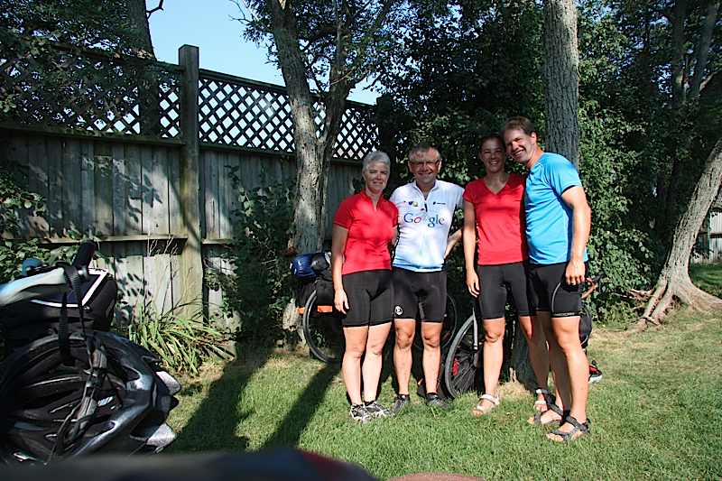 Wir verstauten vor dem Supermarkt in Brighton unsere Lebensmittelvorräte als zwei bepackte Velos den selben Laden ansteuerten – eine seltene Begegnung! Ken und Joslin waren gerade dabei den Lake Ontario mit den Velos zu umrunden. Als wir uns nach dem Mittagessen auf der Strasse zufällig wieder begegneten, beschlossen wir, uns den Campingplatz in Consecon zu teilen. Wir verbrachten einen unterhaltsamen und gemütlichen Nachmittag / Abend mit einer Abkühlung im Pool und Gesprächen beim Abendessen zusammen!