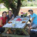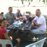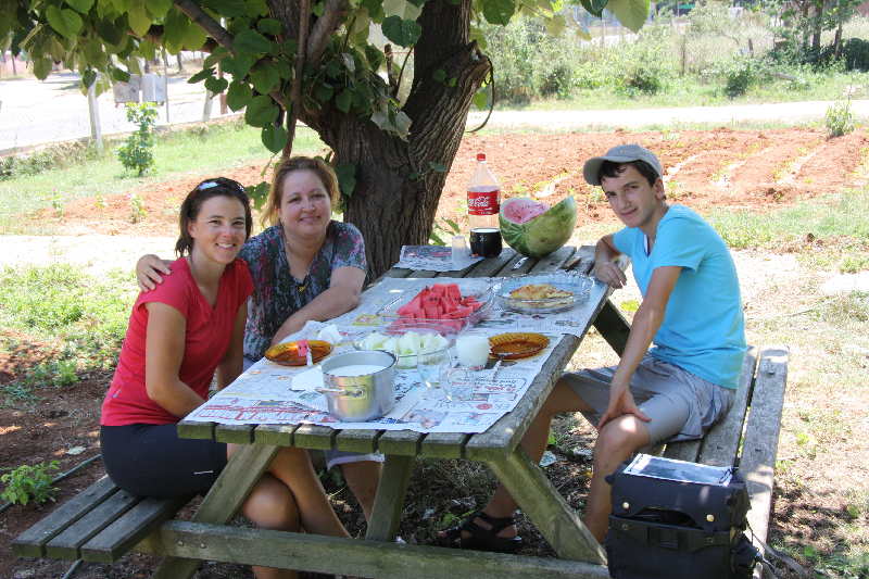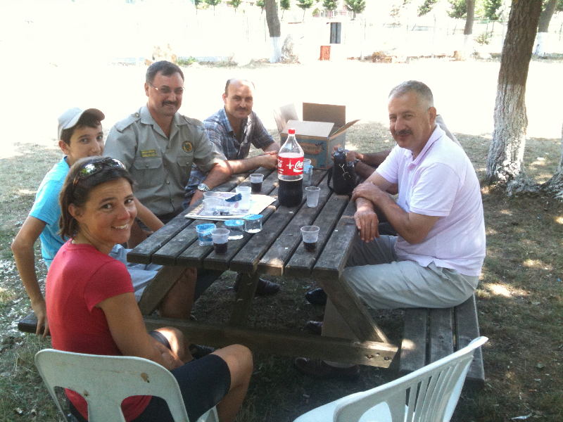 Eigentlich wollten wir nur kurz unseren Wasservorrat auffüllen bei einem Picknickplatz mit „Büfe“. Wir wurden gleich an einen Tisch gerufen. Die Englisch-Kentnisse von Alparslan beschränkten sich auf die üblichen Sätze. Diese waren schnell beantwortet und als wir dann nach „Su“ fragten (Wasser auf türkisch) wollten sie erklären, dass das „Büfe“ geschlossen sei (Denken wir, obwohl es hat nicht so ausgesehen). Ein paar mal telefonieren und dann ist einer mit dem Auto davon. Einige Zeit später standen ein Kiste mit Wasser und 2 Liter Cola auf dem Tisch. Als wir verabschieden wollten, sollten wir noch Alparslans Mutter besuchen. Und schon sassen wir bei der Familie Arslan im Garten, wurden mit Melonen, Ayran und irgend einem Gebäck mit Käse bewirtet. Viel Neues besprechen konnten wir leider nicht mehr ;-). Zum Abschied wurde uns noch 5 Liter Wasser hinten aufgeschnallt. Vielen Dank!