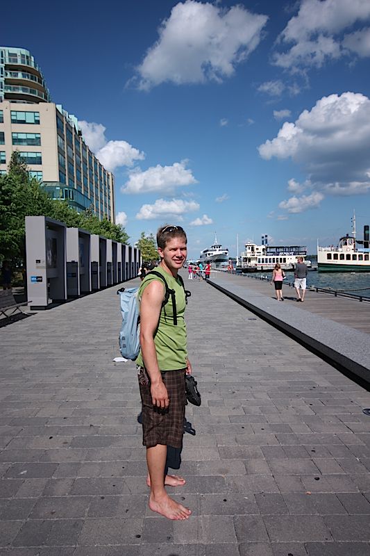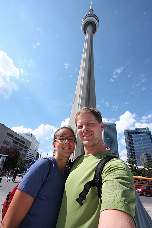 Toronto, mit 4,5 Mio. Einwohnern Kanadas grösste Stadt, hiess uns mit heissem und schwülem Sommerwetter willkommen! Obwohl wir normalerweise die Aufenthalte in den Städten während unserer Reise sehr geniessen, fühlten wir uns in Toronto nicht wirklich wohl. Noch viel zu sehr waren wir auf Europa eingestellt und vermissten die Fussgängerzone in der Altstadt (die es ja gar nicht gab), die schönen Cafés und gemütlichen Parks. Dennoch waren die hohen Bauten, die riesigen Werbeflächen und das pulsierende Stadtleben beeindruckend. Nach einem Tag hatten wir genug gesehen, unser Kartenmaterial besorgt, das Kino besucht und setzten uns wieder auf unser Tandem.